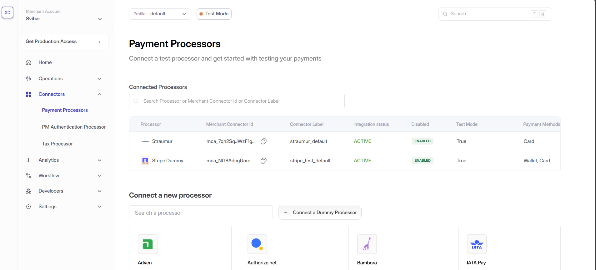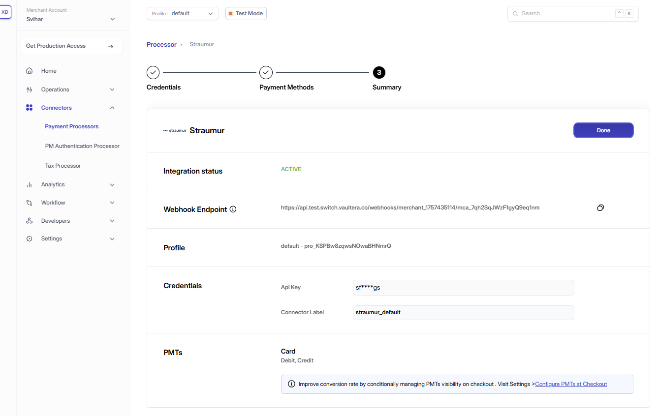 Your connector is now ready to process payments! Start by creating your first payment intent and testing the complete flow.